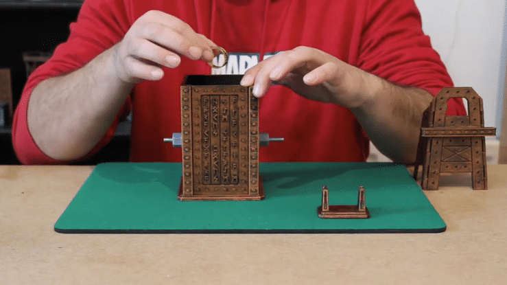 次に、指輪が箱の上部にかざされ、演者は指輪を箱の中に落とし、中のロッドに当てると説明します。