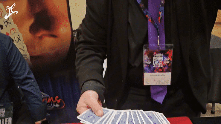 ・マジシャンは普通のデックを取り出し、その半分を観客に渡します。