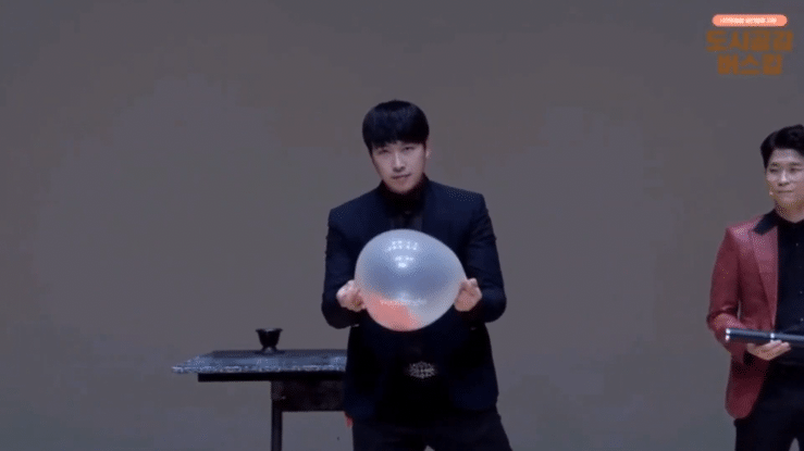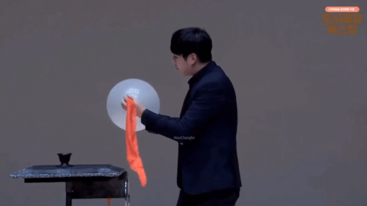 マジシャンはその後、風船からシルクを引き抜き、風船は完全に無傷のまま残ります。