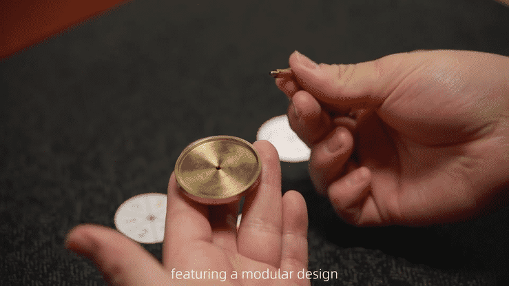 真鍮製のコマと、複数のシンボル・数字・カラーが描かれたディスクを取り出します。